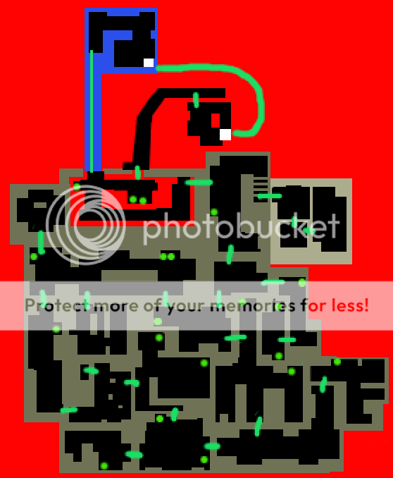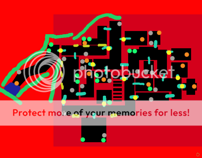 Orange dots are Keys, Yellow Dots are locked doors, Green Dots are Health, Grey Dots are Ammo, Yellow lines are Windows, Green Lines are just backround Trees, Blue is Water, Blue Lines are Zone pathways.