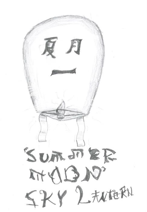First I drew out the basic shapes then smoothed them. Then I added the Text and researched Chinese symbols, to find nice looking ones that spelt 'Summer Moon'. Then I scanned it in to the computer and went over every line, then filled in and coloured it.