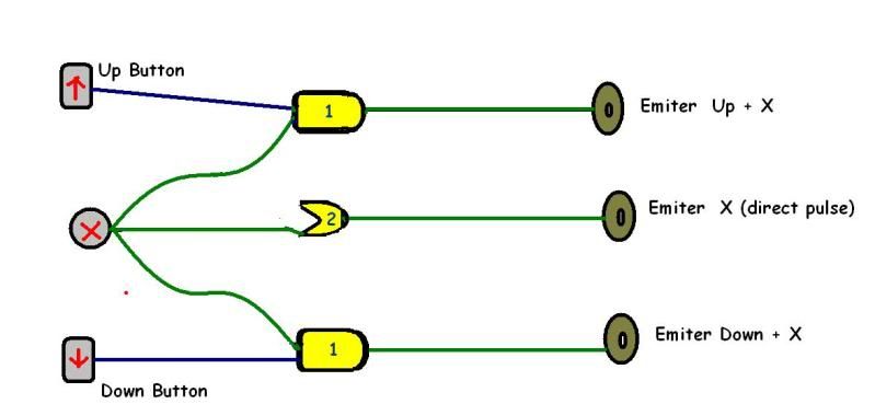Now, when it is X and not UP and not DOWN, the X-only emitter will be triggered by itself.