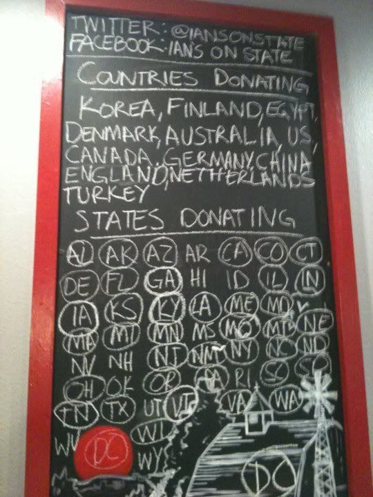 Egyptians, Koreans, Germans, and many more are donating pizza to the protesters in Wisconsin. They are calling in and placing orders to "Ian's," a pizza shop in Madison. They've got a Twitter and Facebook as well, and have gotten a big blackboard together of places that have placed orders to them, for everyone protesting in the capitol. States are abbreviated and circled as they contribute.